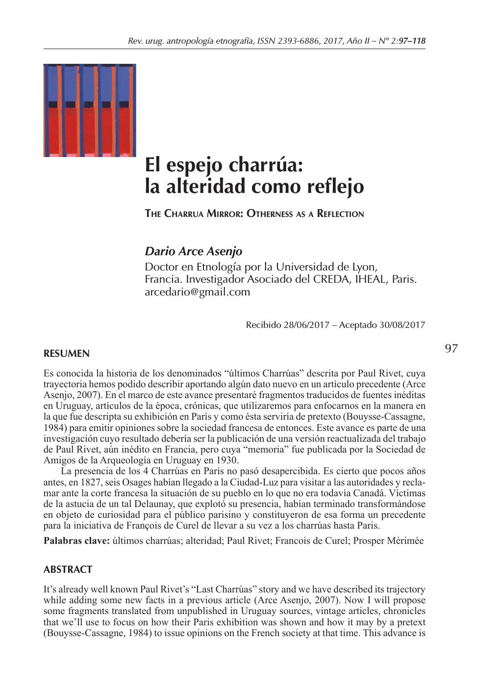 Es conocida la historia de los denominados “últimos Charrúas” descrita por Paul Rivet, cuya trayectoria hemos podido describir aportando algún dato nuevo en un artículo precedente (Arce Asenjo, 2007). En el marco de este avance presentaré fragmentos traducidos de fuentes inéditas en Uruguay, artículos de la época, crónicas, que utilizaremos para enfocarnos en la manera en la que fue descripta su exhibición en París y como ésta serviría de pretexto (Bouysse-Cassagne, 1984) para emitir opiniones sobre la sociedad francesa de entonces. Este avance es parte de una investigación cuyo resultado debería ser la publicación de una versión reactualizada del trabajo de Paul Rivet, aún inédito en Francia, pero cuya “memoria” fue publicada por la Sociedad de Amigos de la Arqueología en Uruguay en 1930. La presencia de los 4 Charrúas en París no pasó desapercibida. Es cierto que pocos años antes, en 1827, seis Osages habían llegado a la Ciudad-Luz para visitar a las autoridades y reclamar ante la corte francesa la situación de su pueblo en lo que no era todavía Canadá. Víctimas de la astucia de un tal Delaunay, que explotó su presencia, habían terminado transformándose en objeto de curiosidad para el público parisino y constituyeron de esa forma un precedente para la iniciativa de François de Curel de llevar a su vez a los charrúas hasta Paris.
